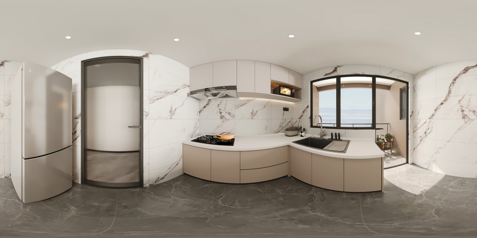 • Open-plan kitchen with quartz countertops